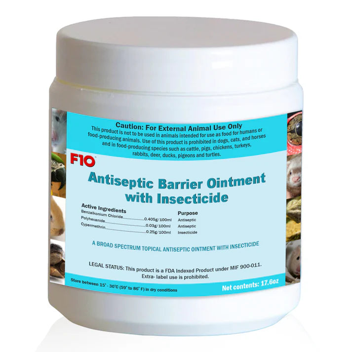 - Wide Range: The F10 Antiseptic Barrier Ointment With Insecticide is effective against a variety of bacteria, fungi, and viruses. The long-lasting insecticide helps to repel insects and eliminate fly strike infestations